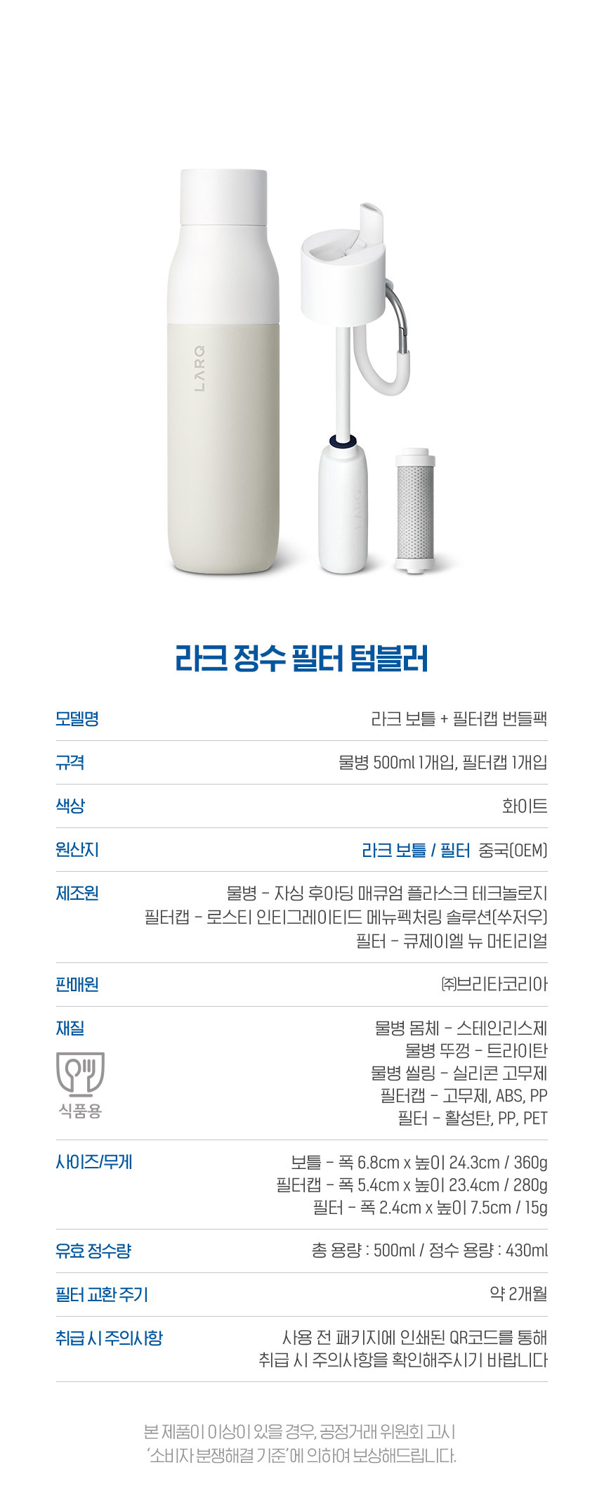 - 품명 및 모델명: 라크 정수 필터 텀블러 화이트 500ml