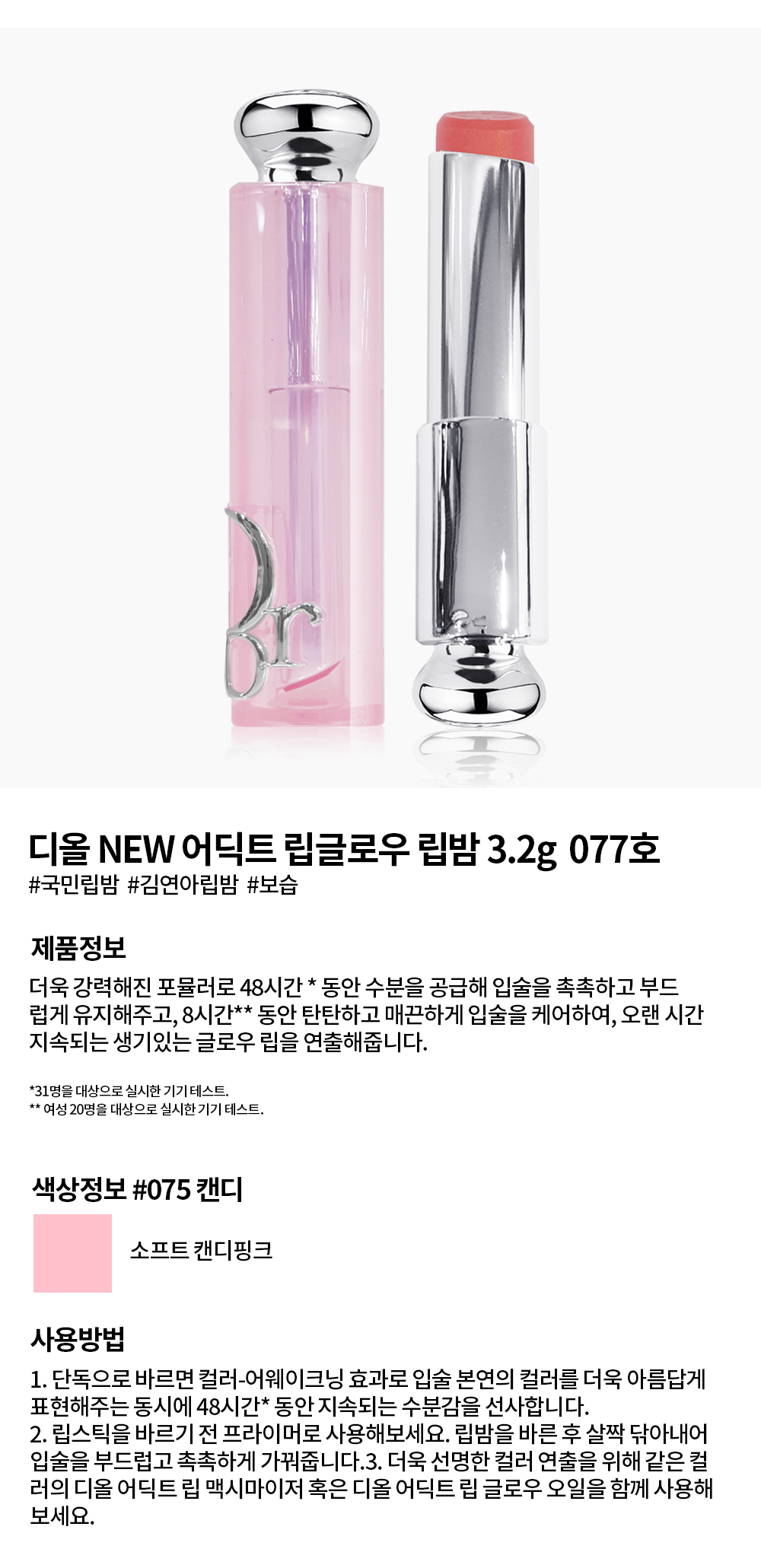 - 사용방법: 1. 단독으로 바르면 컬러-어웨이크닝 효과로 입술 본연의 컬러를 더욱 아름답게 표현해주는 동시에 24시간 동안 지속되는 수분감을 선사합니다. 2. 립스틱을 바르기 전 프라이머로 사용해보세요. 립밤을 바른 후 살짝 닦아내어 입술을 부드럽고 촉촉하게 가꿔줍니다. 3. 더욱 선명한 컬러 연출을 위해 같은 컬러의 디올 어딕트 립 맥시마이저 혹은 디올 어딕트 립 글로우 오일을 함께 사용해보세요. 11명을 대상으로 실시한 기기 테스트