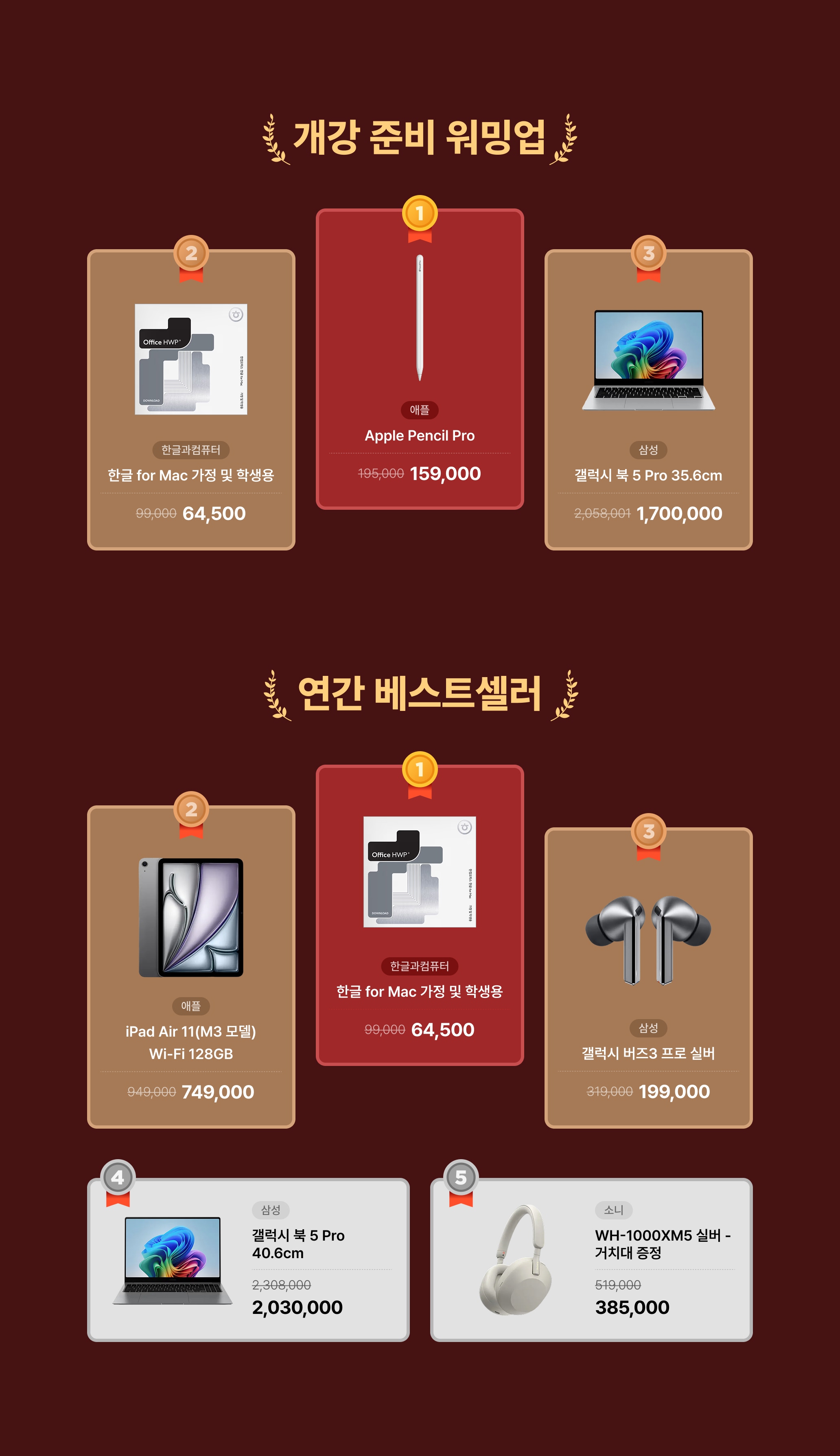 1위 애플펜슬 2위 한컴 3위 갤북 1위 한컴 2위 아이패드 에어 3위 갤럭시 버즈 4위 갤북 5 5위 소니 헤드폰