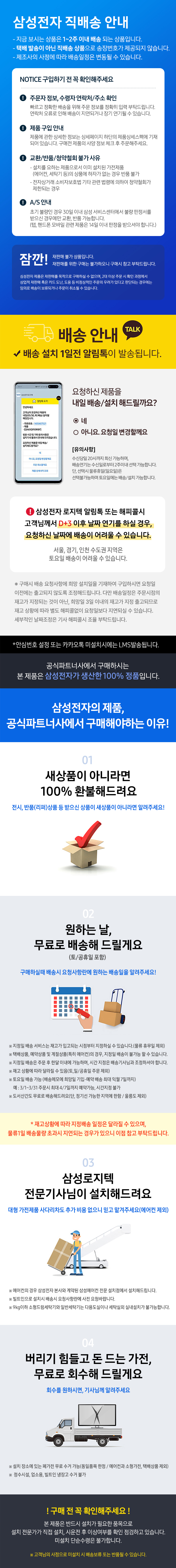 1. 교환/반품 기간 - 단순 변심에 의한 상품의 교환·반품은 실제 상품 등을 수령하신 날부터 7일 이내에 가능합니다. 단, 상품 안내 페이지에 표시된 교환/반품 기간이 7일보다 긴 경우에는 그 기간을 따릅니다. - 수령한 상품 등의 내용이 표시·광고 내용과 다르거나 오배송 등 계약 내용과 다르게 이행된 경우에는 수령하신 날부터 3개월 이내,그 사실을 안 날 또는 알 수 있었던 날부터 30일 이내에 가능합니다. - 제품을 교환/반품하기 전 고객센터(1811-5988)로 미리 연락을 주셔야 합니다. - 제품 자체에 하자가 있는 경우 삼성전자 서비스센터(1588-3366)로 접수하시면 A/S 기사의 판정을 거친 후 소비자분쟁해결기준에 의거하여 삼성전자 서비스 센터를 통해 교환/환불/수리해드립니다. - 미성년자인 고객이 구매계약을 체결한 후, 법정대리인이 그 계약에 동의하지 아니하면 본인 또는 법정대리인이 취소할 수 있습니다. 2. 교환/반품 배송비 - 구매하신 상품의 교환·반품을 하시는 경우에는 상품 등의 반환에 필요한 비용을 고객님이 부담하셔야 합니다. 단, 고객님이 받으신 상품 등의 내용이 표시·광고 내용과 다르거나 제품하자·오배송 등 계약 내용과 다르게 이행되어 교환/반품을 하시는 경우에는, 교환·반품 배송비는 무료입니다. 3. 환불 지연 배상금 지급 안내 - 대금 환불 및 환불 지연에 따른 배상금 지급 조건, 절차 등은 전자상거래 등에서의 소비자 보호에 관한 법률에 따라 처리합니다.