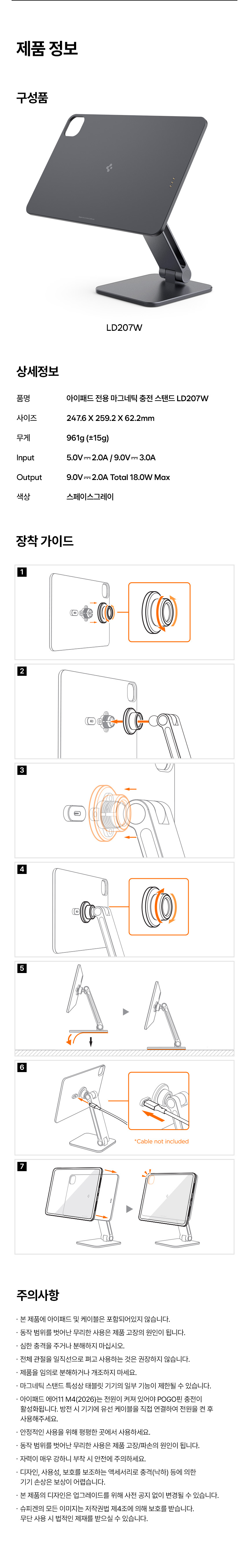 - 품명 및 모델명: 아이패드 마그네틱 포고핀 무선 충전 거치대 스탠드 LD207W