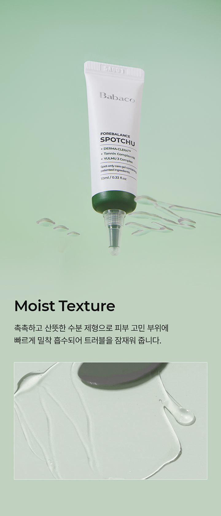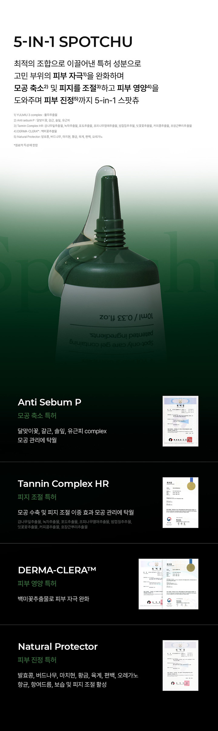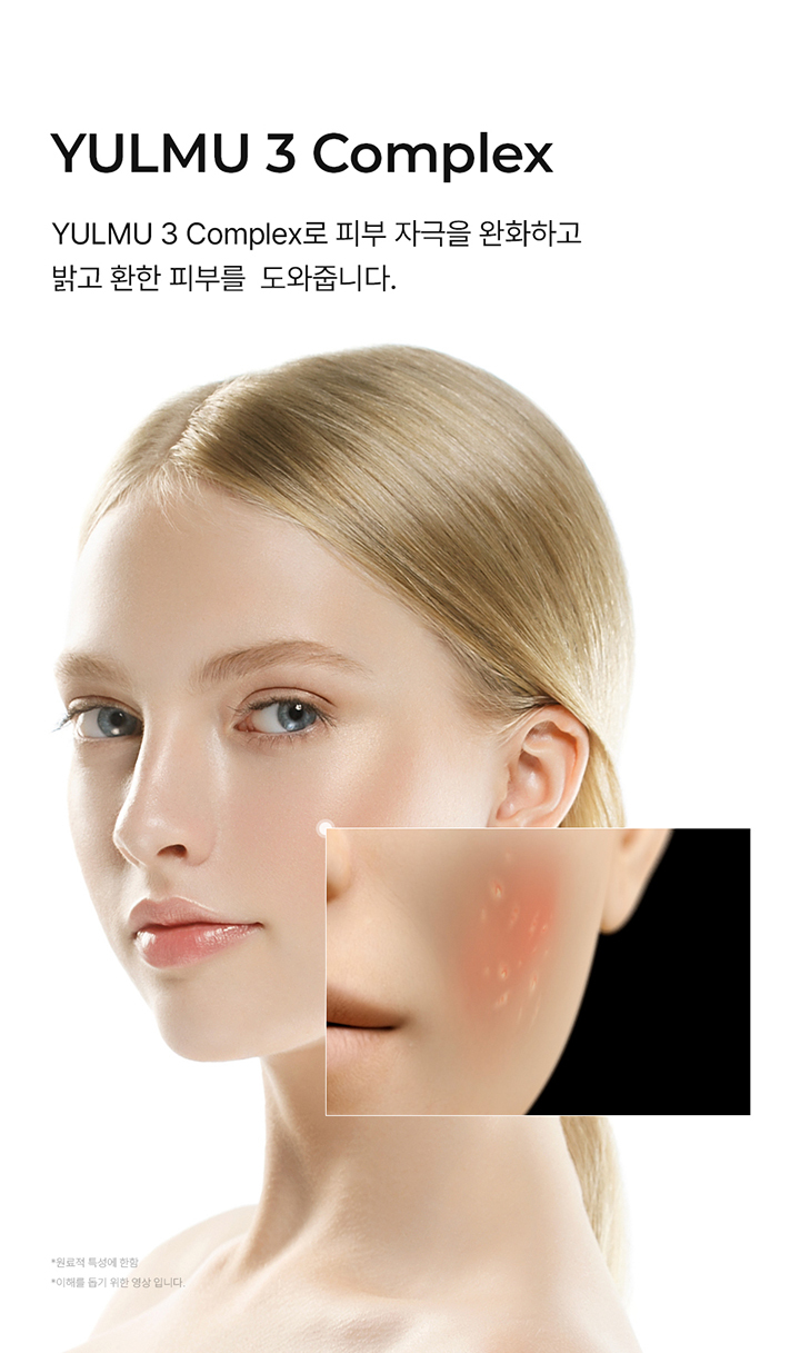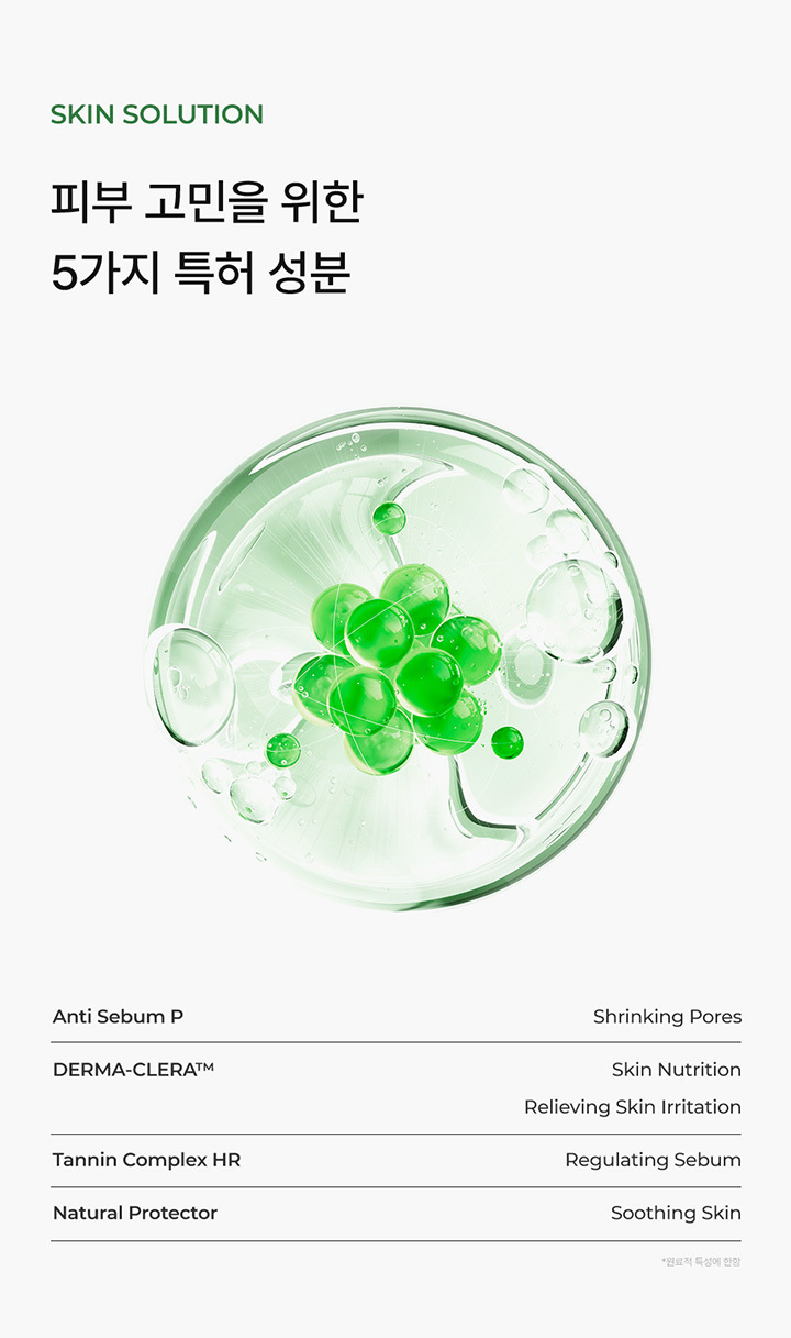 - 주요성분: 정제수, 부틸렌글라이콜, 프로판다이올, 에탄올, 나이아신아마이드, 1,2-헥산다이올, 다이메틸설폰, 폴리글리세릴-10라우레이트, 암모늄아크릴로일다이메틸타우레이트/브이피코폴리머, 아크릴레이트/C10-30알킬아크릴레이트크로스폴리머, 알지닌, 소듐폴리아크릴레이트, 에틸헥실글리세린, 도금양열매추출물, 아데노신, 다이소듐이디티에이, 편백잎추출물, 흰버드나무껍질추출물, 오레가노잎추출물,백미꽃추출물, 락토바실러스/콩발효추출물, 황금추출물, 쇠비름추출물, 육계나무껍질추출물, 대왕소나무잎추출물, 칡뿌리추출물, 달맞이꽃꽃추출물, 당느릅나무뿌리추출물, 포도추출물, 감나무잎추출물, 율무씨추출물, 율무씨수, 효모/율무씨발효여과물, 호장근뿌리추출물, 커피콩추출물 ,잇꽃꽃추출물, 밤껍질추출물 ,녹차추출물, 초피나무열매추출물, 토코페롤