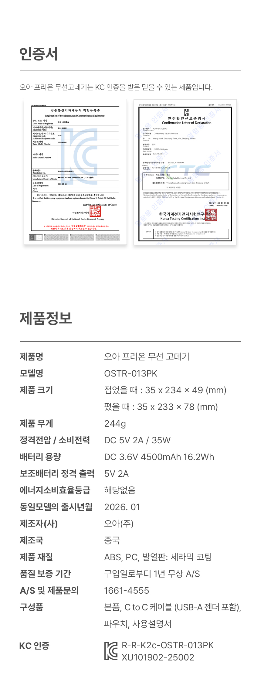 - 품질보증기준: 제조사페이지참조